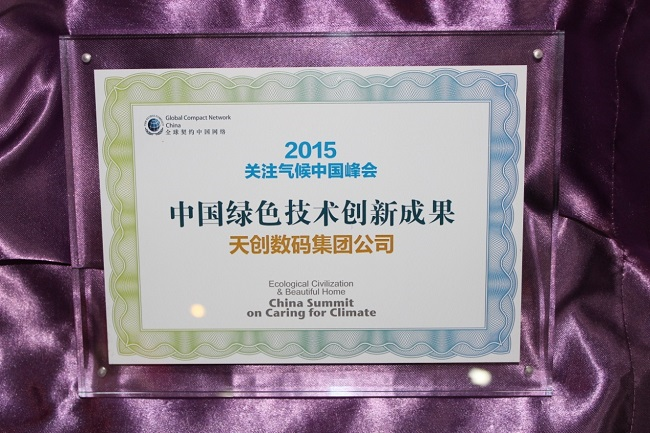 同天下午,“關(guān)注氣候 行動(dòng)引領(lǐng)未來——碳機(jī)制與企業(yè)的角色”、“上善若水 綠水常在——水資源發(fā)展與水治理”、“科技驅(qū)動(dòng) 大眾創(chuàng)業(yè)——科技創(chuàng)新驅(qū)動(dòng)綠色發(fā)展”等環(huán)保主題分論壇也相繼開展。天創(chuàng)數(shù)碼集團(tuán)作為UNGC會(huì)員單位出席了此次活動(dòng),并憑借“適用即可”的環(huán)保科技理念和行動(dòng),榮獲了“中國(guó)綠色技術(shù)創(chuàng)新成果”獎(jiǎng)。